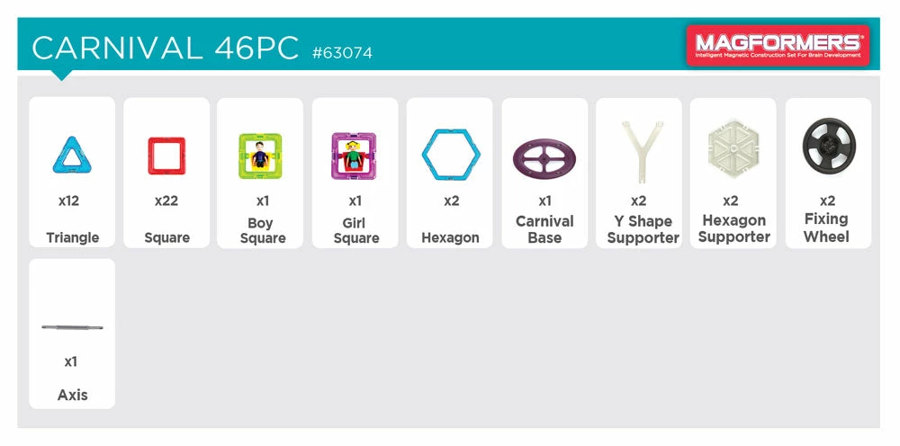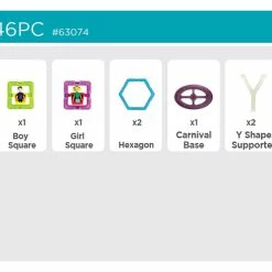 Build with 12 Rainbow Triangles, 22 Squares, 2 Hexagons, 8 Carnival Accessories and 1 boy and 1 girl character.