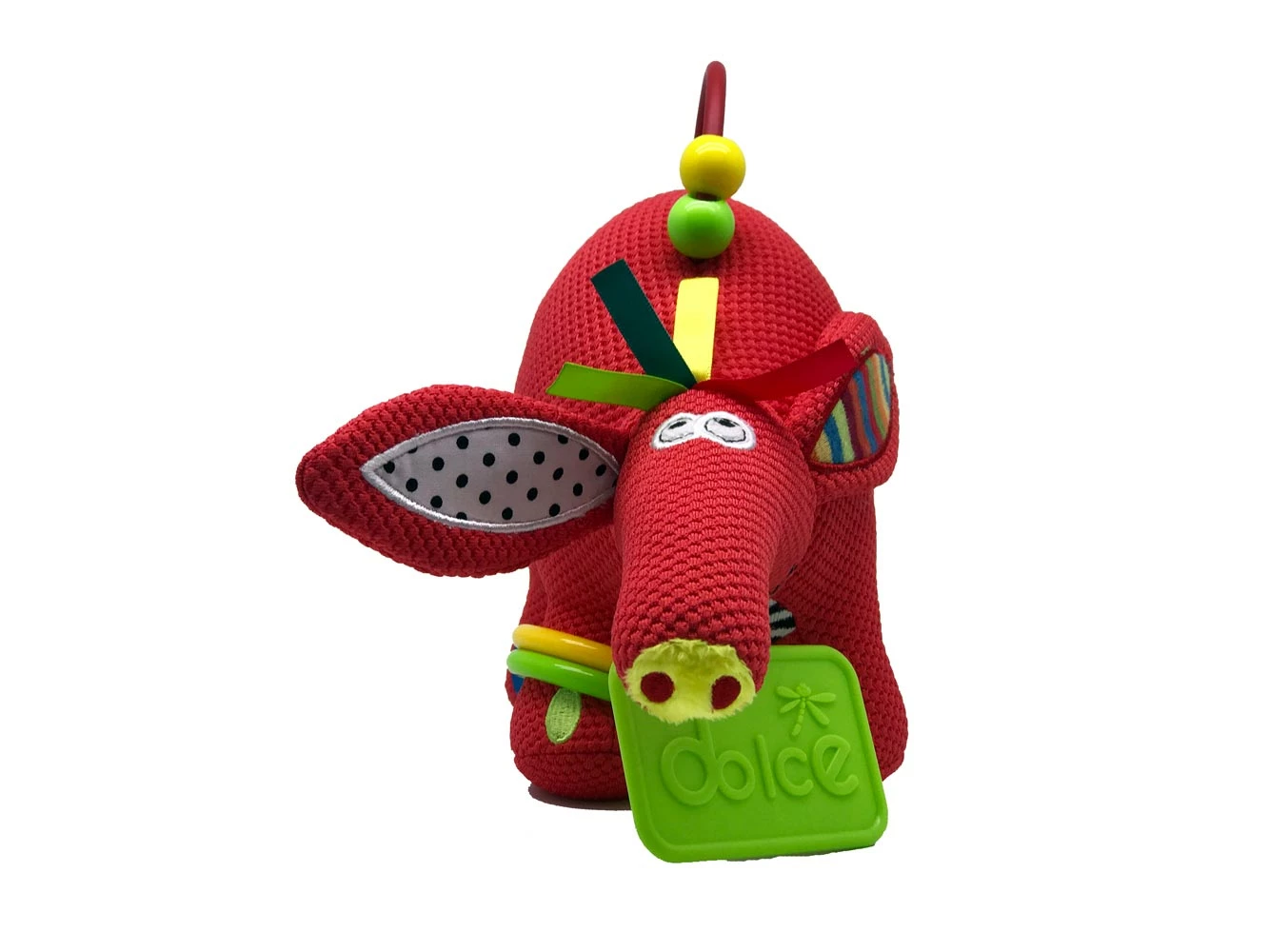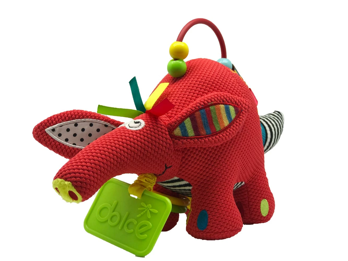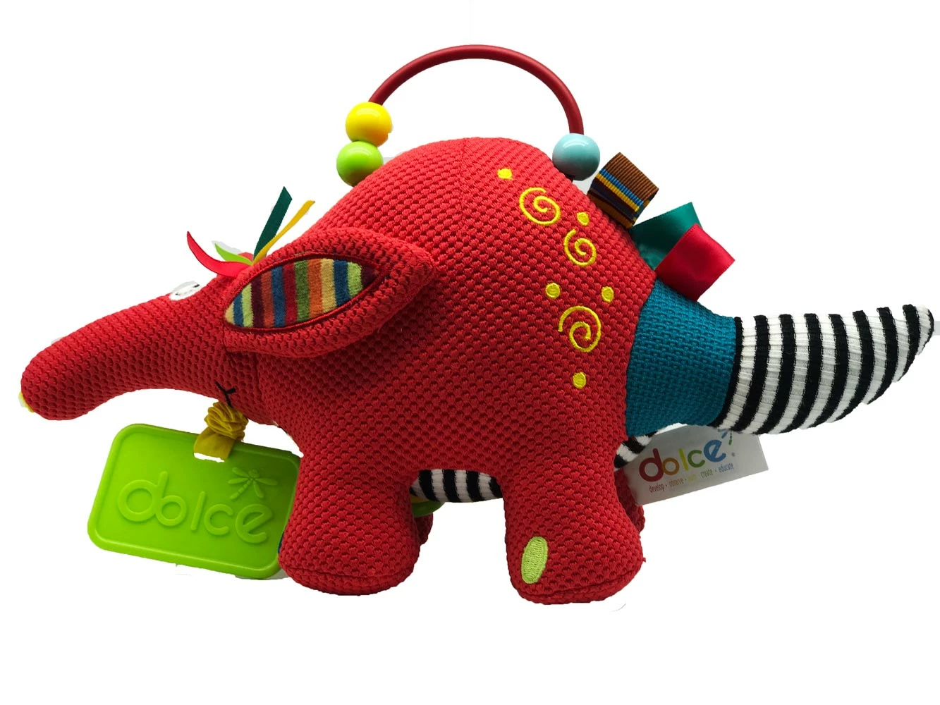 Get ready for the newest product from Dolce. The baby aardvark, the perfect companion for your young one. Watch as your baby explores the colorful animal and learns new sensory and hand-eye coordination skills. With parts that crinkle, a squeak and beans in the feet, the Dolce Baby Aardvark is great for children of young ages. Pull on the dragonfly and feel as the Aardvark vibrates.