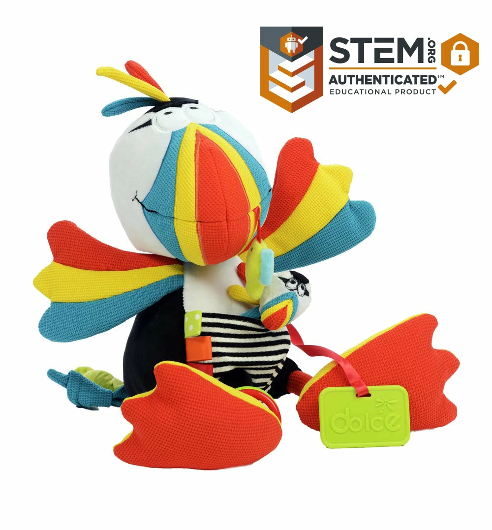 Dolce stands for Develop, Observe, Learn, Create, Educate. Let your baby DEVELOP their sensory skills with the wide variety of high quality textured fabrics. Your little one will love to OBSERVE the fun colorful fabrics and LEARN to understand cause and effect through the many interesting activities in our toys. CREATE fun, learning and roleplay with your favorite Dolce friend. Let the beautiful, interesting and activity rich Dolce toys EDUCATE through play.
