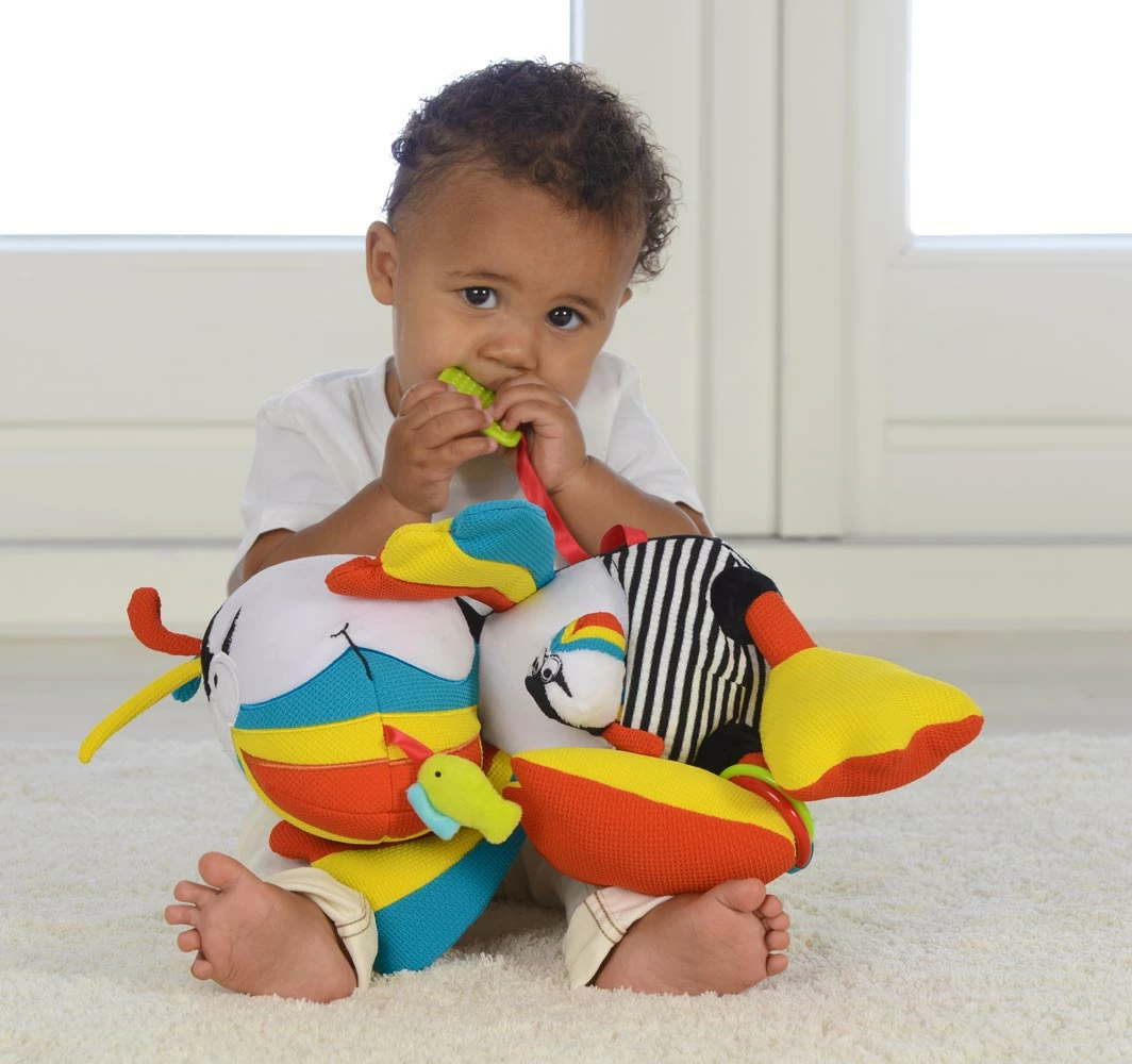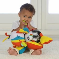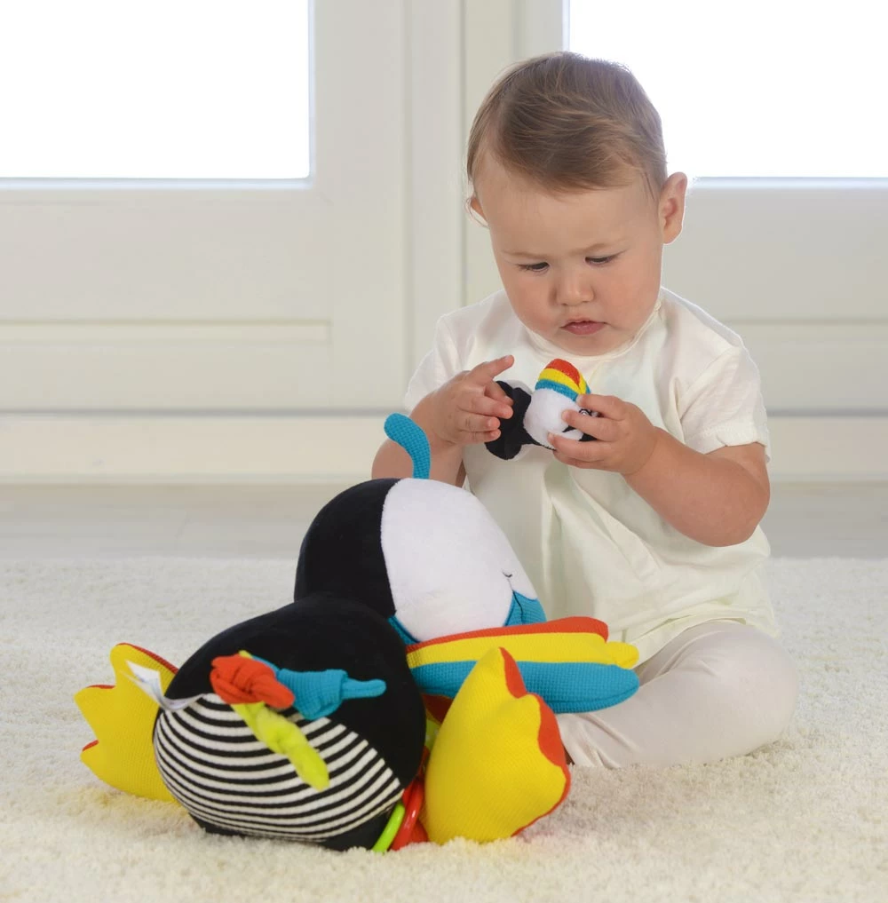 Dolce Puffin Plush is the perfect toy for stimulating your new child’s senses. This colorful puffin character has its own Dolce teether, with soft fabrics crinkle in the wings and a ring collar on the foot, the puffin is sure to promote your child’s tactile and auditory sense.
