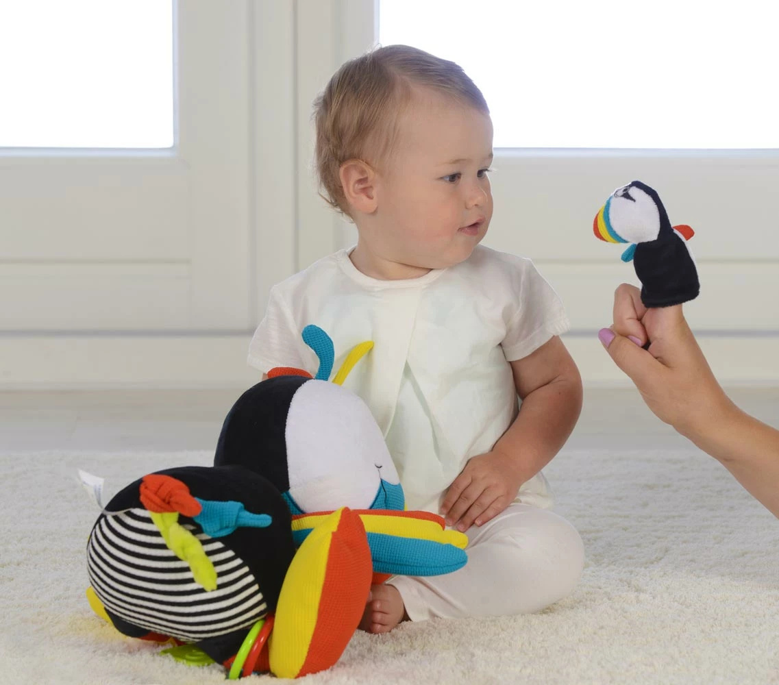 Designed specifically for newborns and young children in mind, the Dolce Plush Puffin is perfect for cuddling. As your child holds onto the Puffin they notice the bright colors, the beans in the feet and the soft textured fabric. Arrives with a bonus Puffin finger puppet!