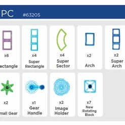 Build with 4 triangles, 15 squares, 6 rectangles, 4 super rectangles, 4 super sectors, 2 arches, 2 super arches, 1 character, 2 square playground inserts, 4 image plates, 7 gears, 1 gear handle, 2 image holders and 7 rotating blocks.