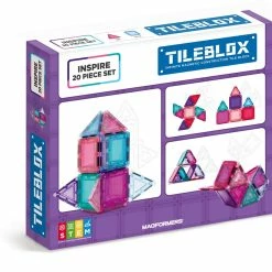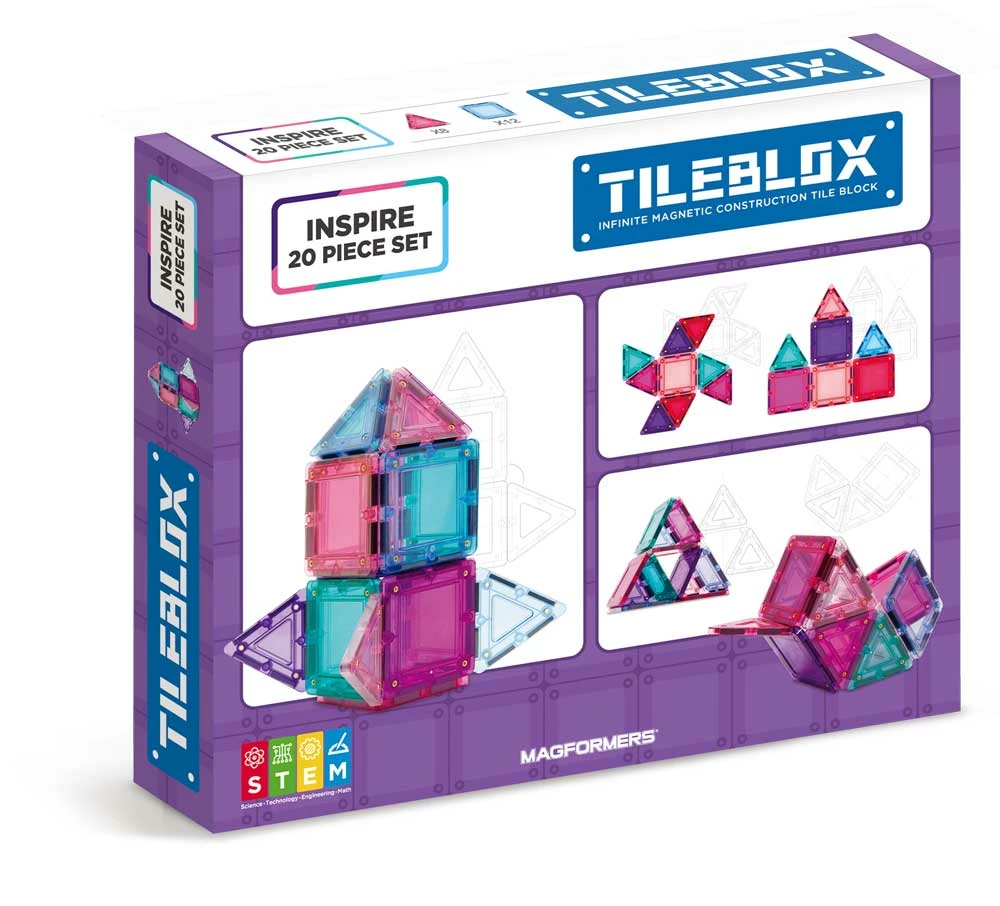 Let your imagination run wild with the all new Inspire 20Pc Tileblox magnetic set. Build a ball, cube or house and follow along with the step-by-step idea sheet! Perfect for the beginning builder! Arrives with 20 Magnetic geometric shapes, 8 Triangles and 12 Squares in pink and pastel colors.