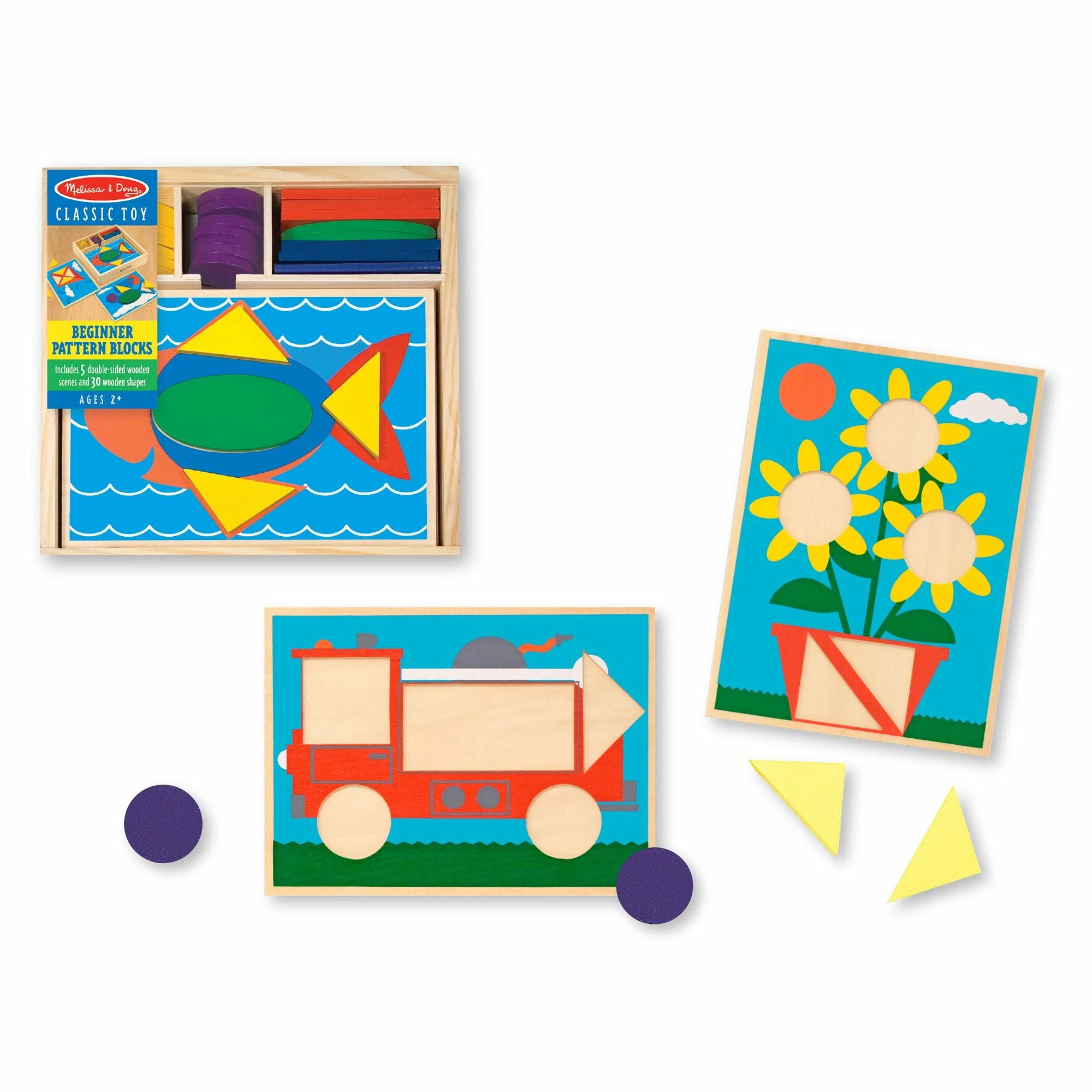 A perfect first manipulative! Five two-sided boards with ten recessed design templates are ready to fill with these brightly colored geometric shapes. Complete the pictures, or create your own designs and matching activities. Everything stores neatly in the sturdy wooden storage box.
