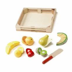 This wooden set features a wooden knife and seven pieces of sliceable fruit that can be cut into a total of 17 pieces. Food makes a realistic “CRUNCH” sound when sliced. With so many pieces, it’s also a great way to introduce the concepts of part, whole and fractions!