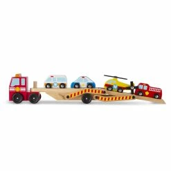 • Wooden play set with a two-level tractor trailer that picks up and delivers four emergency vehicles