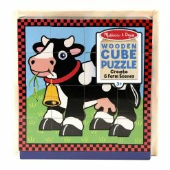 Six puzzles in one! There are 16 solid wooden cubes in this unique puzzle. Rotate the cubes in the included wooden tray to complete colorful pictures of six different farm animals. (The border design provides a helpful hint!)