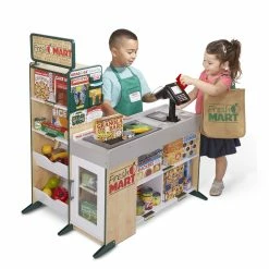 Shopping and playful purchasing is exciting at the sturdy wooden Fresh Mart Grocery Store! The free-standing play space with smooth, curved corners and edges lets customers three and older browse the shelves and pay for purchases on one side, and allows the grocer to ring up items on the other. Realistic features include beeping “scanner,” a hand-crank conveyor belt, a card-swiping machine, a keypad/calculator, and cash drawer. Kids are sure to find everything on their shopping list at this friendly neighborhood grocery store!