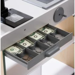 • Includes hand-cranked conveyor belt, beeping “scanner,” bagging area, card swipe machine, and cash drawer