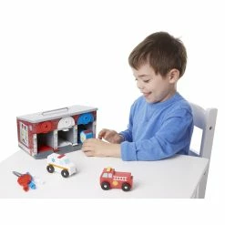 Behind the three doors of this take-along garage are three rescue vehicles ready to roll into action! Match the colored keys to unlock the doors, slide the door to open the garage, press the buttons to release the ramp and send the vehicles racing to the rescue. Store the pieces away and carry off the whole set by its sturdy handle. The real heroes of this story? The dynamic duo of motor-skills practice and imaginative play!