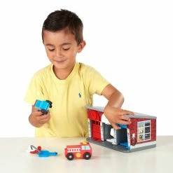 • Three-bay garage with locking doors, color-coded keys, and three wooden rescue vehicles