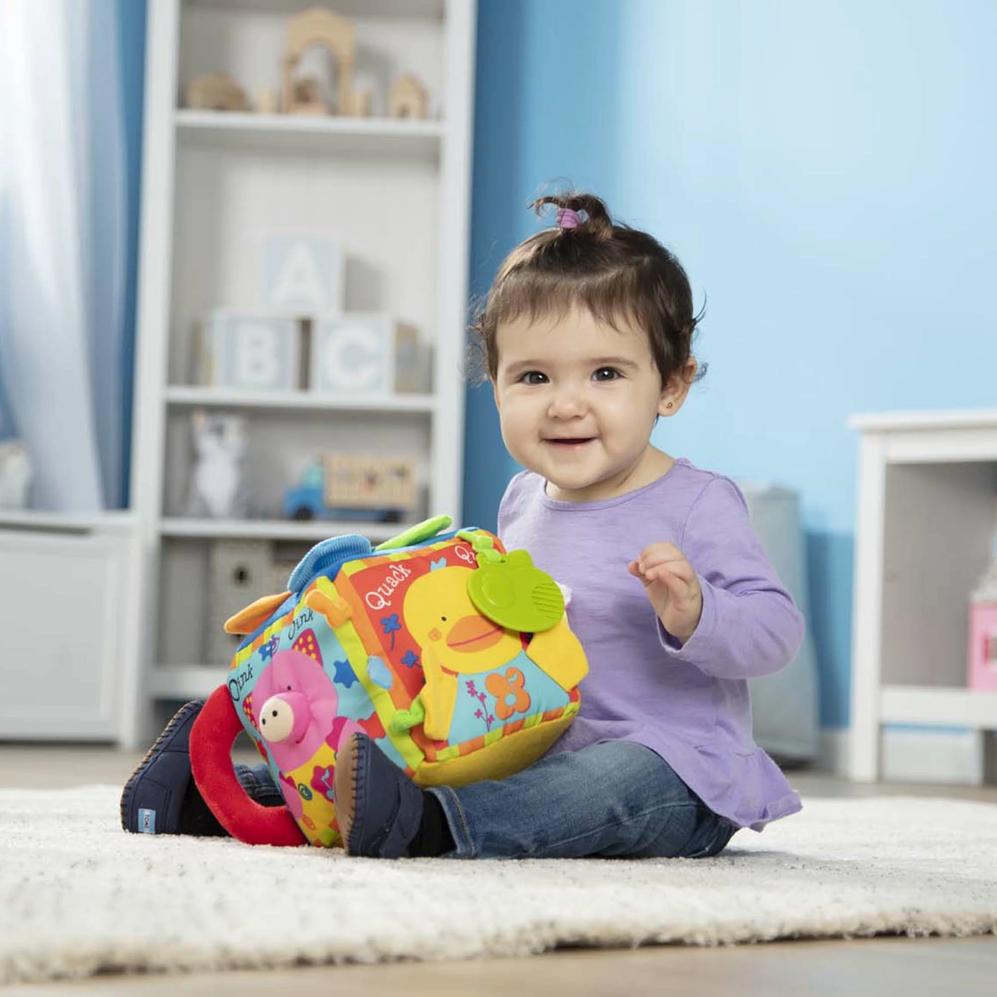 This “farmyard” is full of noisy animals and compact enough to take anywhere! Four animals sound off with their animal songs and play a lively melody when their noses are pressed. Or babies can grasp the padded handle and bump the block against the floor to start the sounds! This feature-filled activity cube also boasts a sturdy teether, knotted tags, crinkly flower petals and tabs, and a toddler-tough plastic mirror.