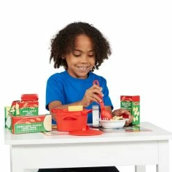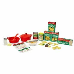 Prepare perfect pretend pasta every time with this 50-plus-piece pasta-making set! Fun pasta boxes hold felt penne, bow tie pasta, linguini, and ravioli pockets that can be hand-stuffed with felt spinach, meat, or cheese fillings. Follow the illustrated guide to order and “cook” the pasta in the large cook pot with lid, and “strain” it in the colander (the box doubles as a cook top and a sink!). Use the pasta spoon to scoop into the included pasta bowl, top with tomato sauce, cheese, or, butter toppings, and dig in! The set also includes a sauce jar, cheese shaker, salt shaker, and fork. This inventive set lets kids create countless imaginative pasta meals from start to finish!