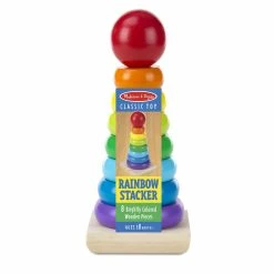 Talk about a classic childhood toy! All the colors of the rainbow are represented by these eight smooth, easy-grasp wooden pieces. Stack them on the solid-wood base, designed with rocking edges for safe and intriguing play.