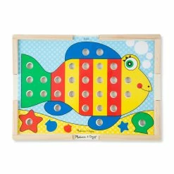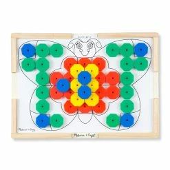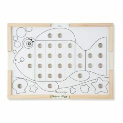 Toddlers will be fascinated and preschoolers will be inspired by this amazing color-matching and creative activity board! Ten reversible picture cards are held in place on a wooden play board when children place the snap caps in the holes. On one side of the picture card is in color for matching. The reverse side shows the picture in black and white, allowing the children to create their own patterns and designs! This activity is great for color recognition, sorting, and beginning math skills…even has 3-D picture suggestions!