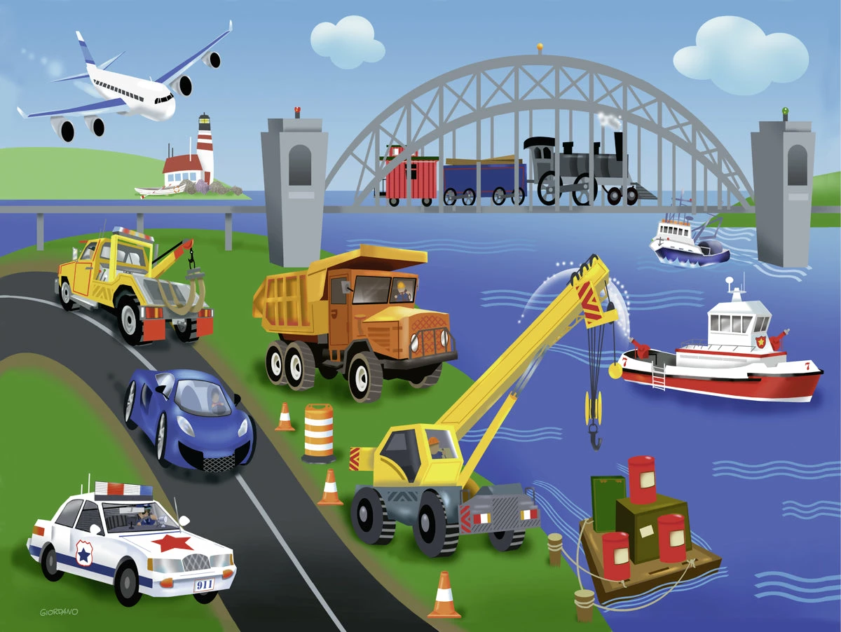 Assemble 24 pieces to reveal a rescue, utility, and transportation vehicles hard at work