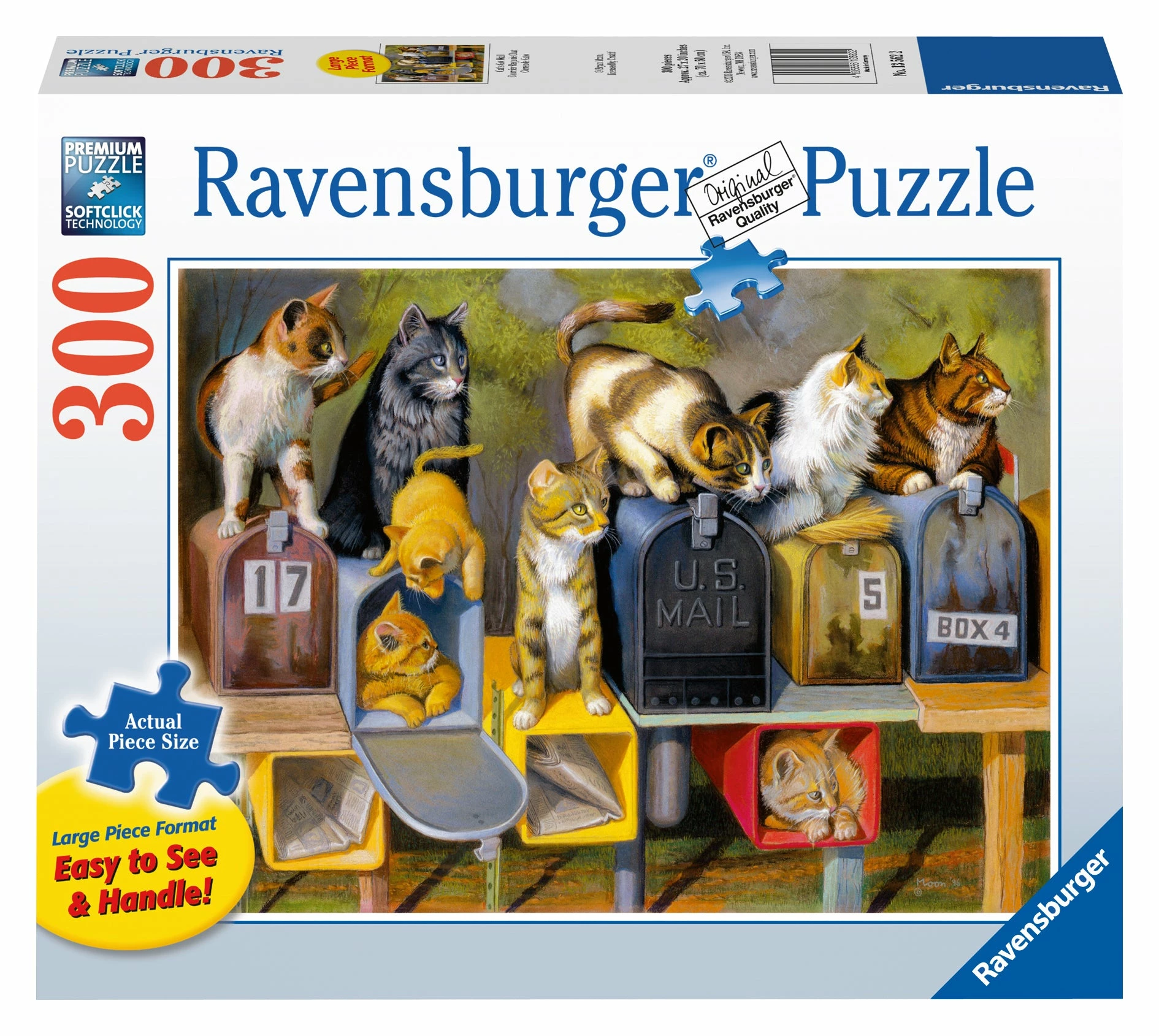 Piece together this 300 piece large format puzzle with easy-grip pieces, featuring cats waiting for the mail to arrive at the mailboxes of their owners.