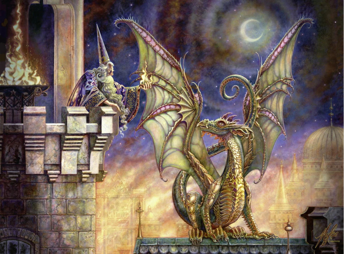 Assemble 100 pieces to reveal a wizard gifting a dragon his firey breath!